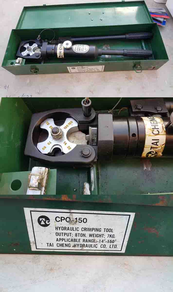 TAI CHENG CPO-150 대만제 유압 터미널 압착기 입니다 미사용 민트급 입니다 동작이나 외관 상태 양호 합니다 부속그대로 있읍니다 사진은 실사 입니다 터미널 압착기:25만원 착불 연락처:101-5251-1533 이기수 기업은행:260-000893-03-012