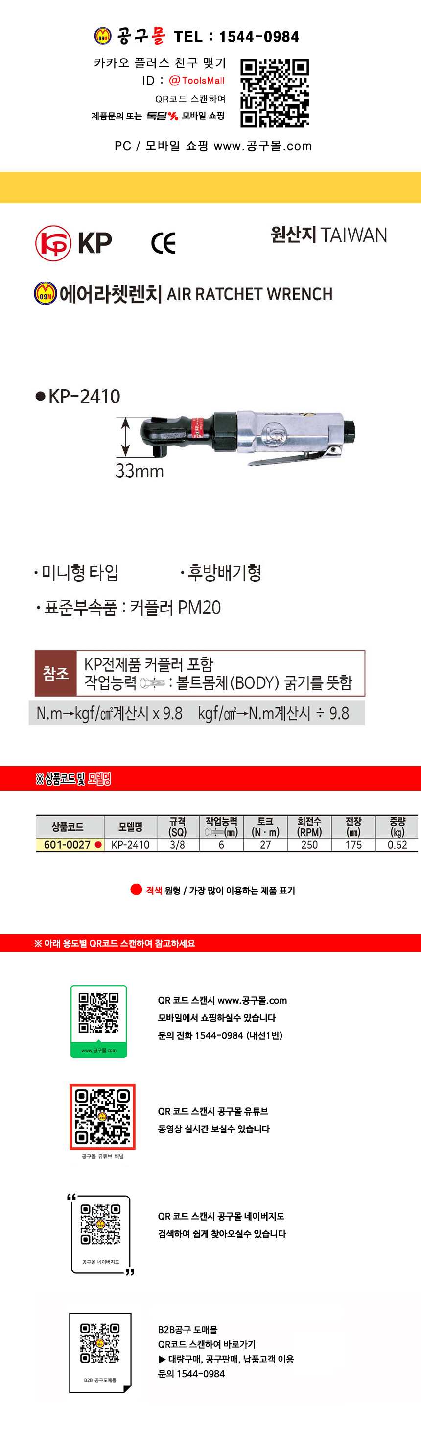 KP 에어라쳇트렌치 KP-2410 (3/8SQ)미니형 에어공구, 에어라체트 공구몰 601-0027