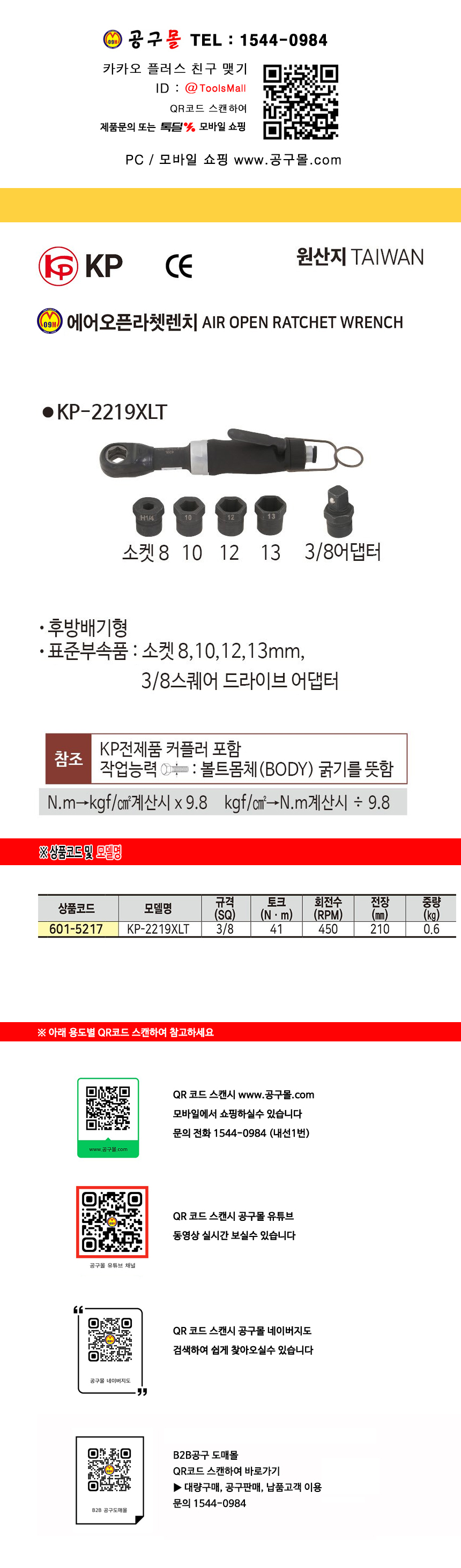 KP 에어오픈라쳇렌치 KP-2219XLT (3/8SQ) 에어공구, 에어라체트 공구몰 601-5217