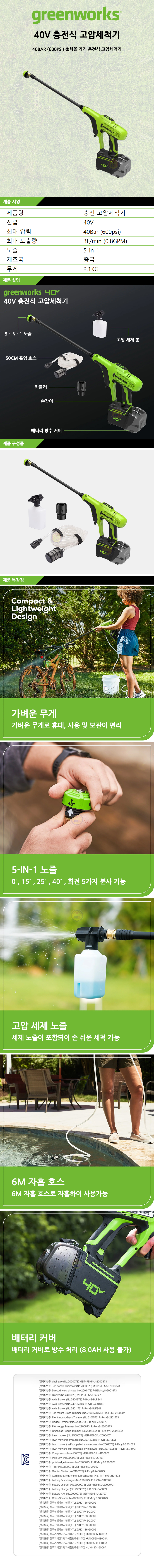 그린웍스 고압세척기(핸드) 40V (베어툴) 세척기 세차용 청소용 배터리 충전기 미포함