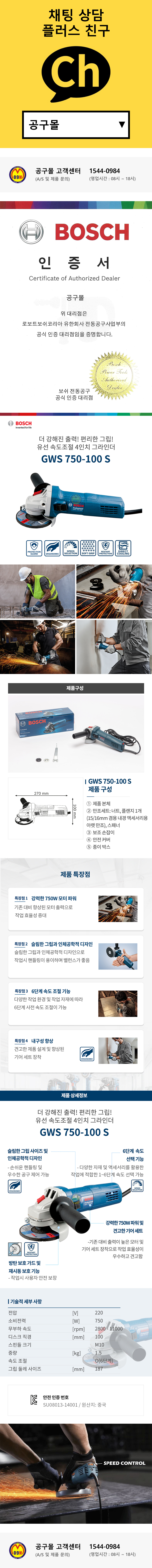 보쉬 속도 조절 그라인더 GWS750-100S (100mm-750W) 절단기 앵글그라인더
