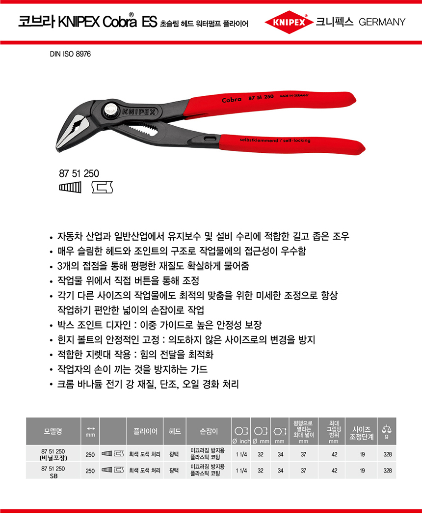 크니펙스 첼라(슬림코브라) 87-51-250, 87-51-250SB KNIPEX 독일공구, 수공구 작업공구 공구몰 101001020334