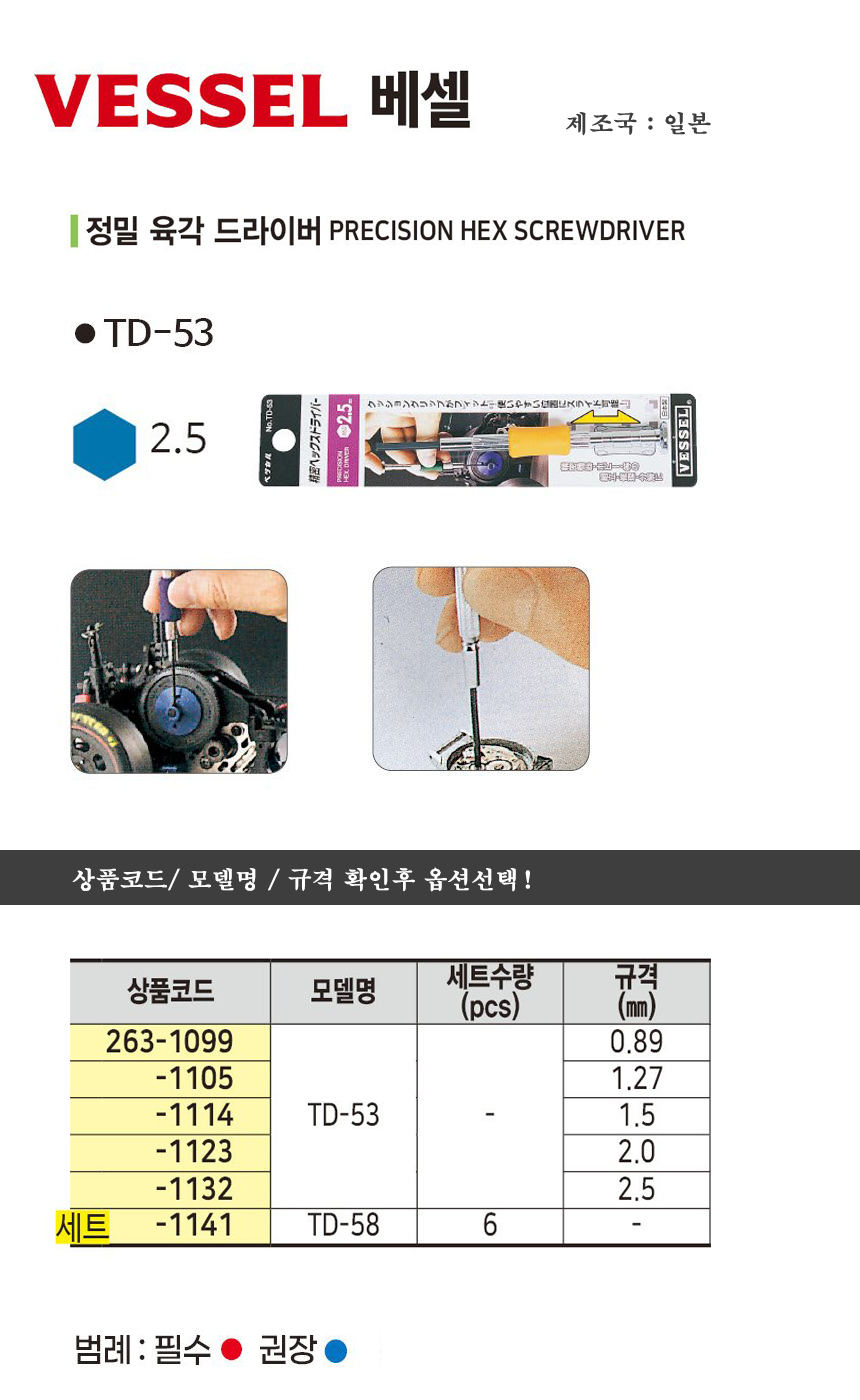 베셀 정밀 육각렌치 드라이버 TD-53x0.89mm/ TD-53x2.5mm VESSEL