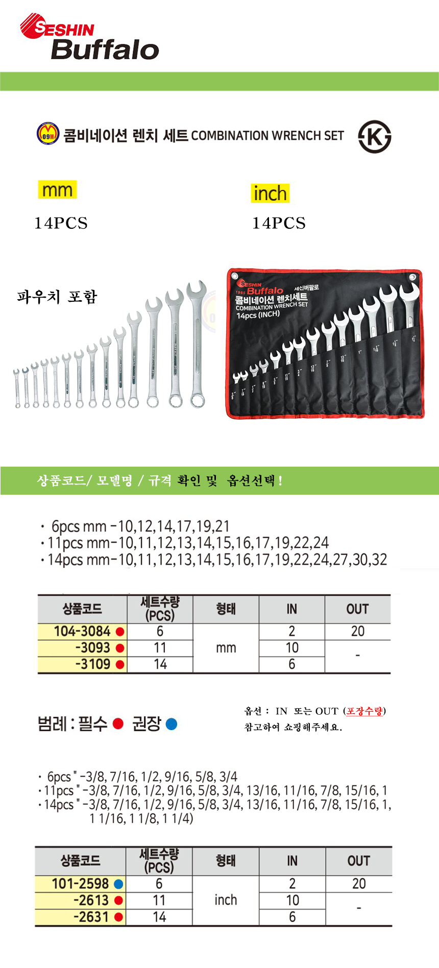 세신 콤비네이션렌치세트(mm / inch) 14pcs 버팔로 공구몰 스패너 104-3109