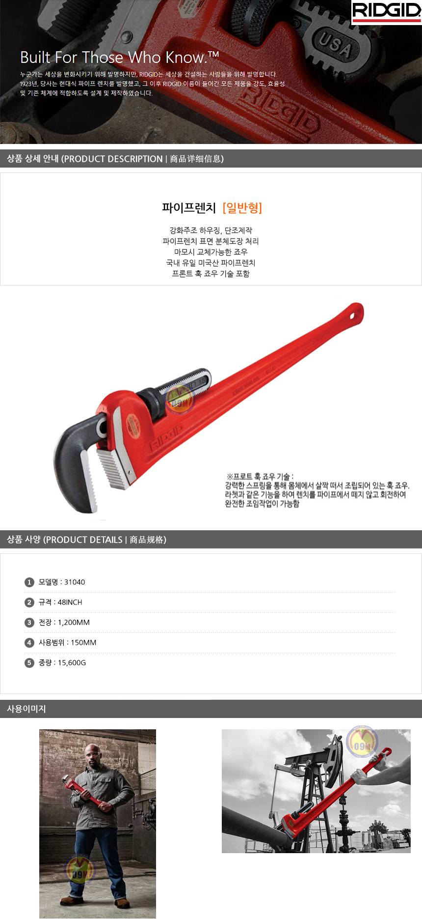 리지드 파이프렌치 31040 (48INCH/1200MM), 렌치, 플라이어,공구몰,251-2776