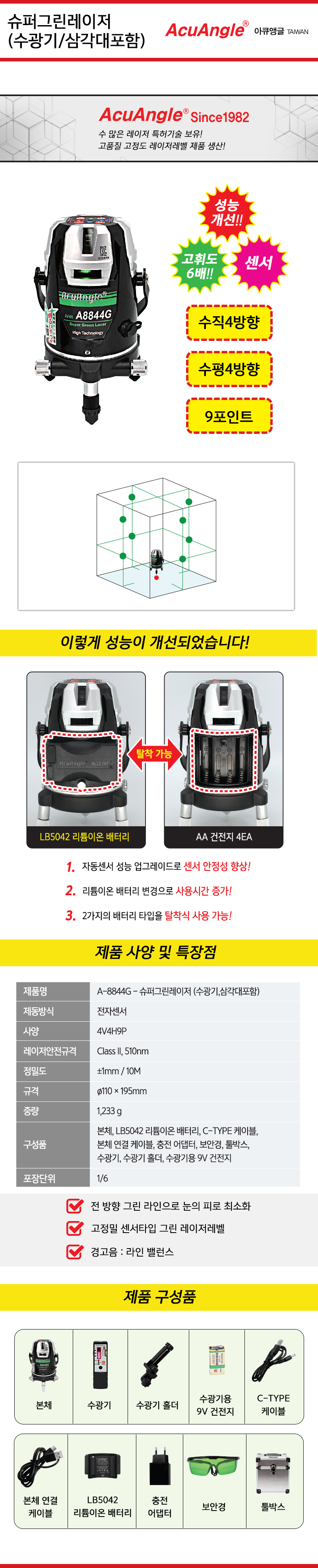 아큐앵글 그린 레이저레벨기 A-8415J (삼각대포함) 4V1H, 6포인트, 아큐앵글, ACUANGLE