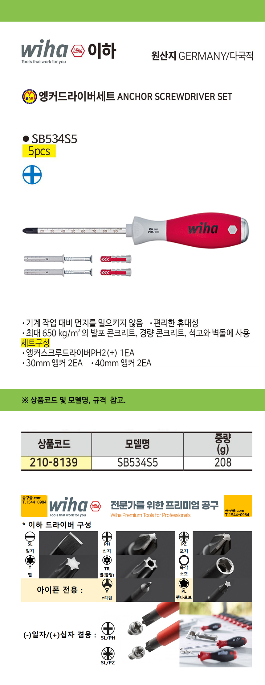 이하 앵커드라이버 십자세트 SB534S5 (5PCS) WIHA 공구몰 210-8139