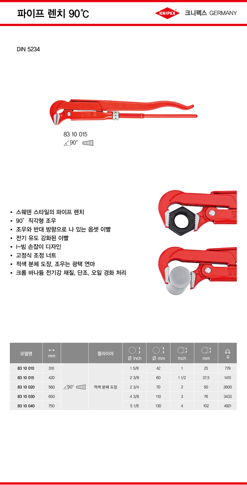 크니펙스 파이프렌치(90도) 83-10-010 KNIPEX 독일공구, 수공구 작업공구 공구몰 101001040003