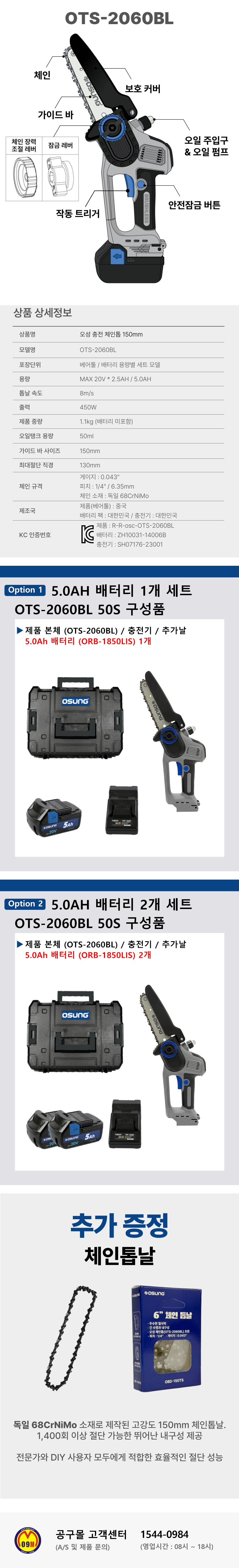 오성 20V 충전체인톱 OTS2060BL (20V-2.5AH-150mm) 미니체인톱 가지용