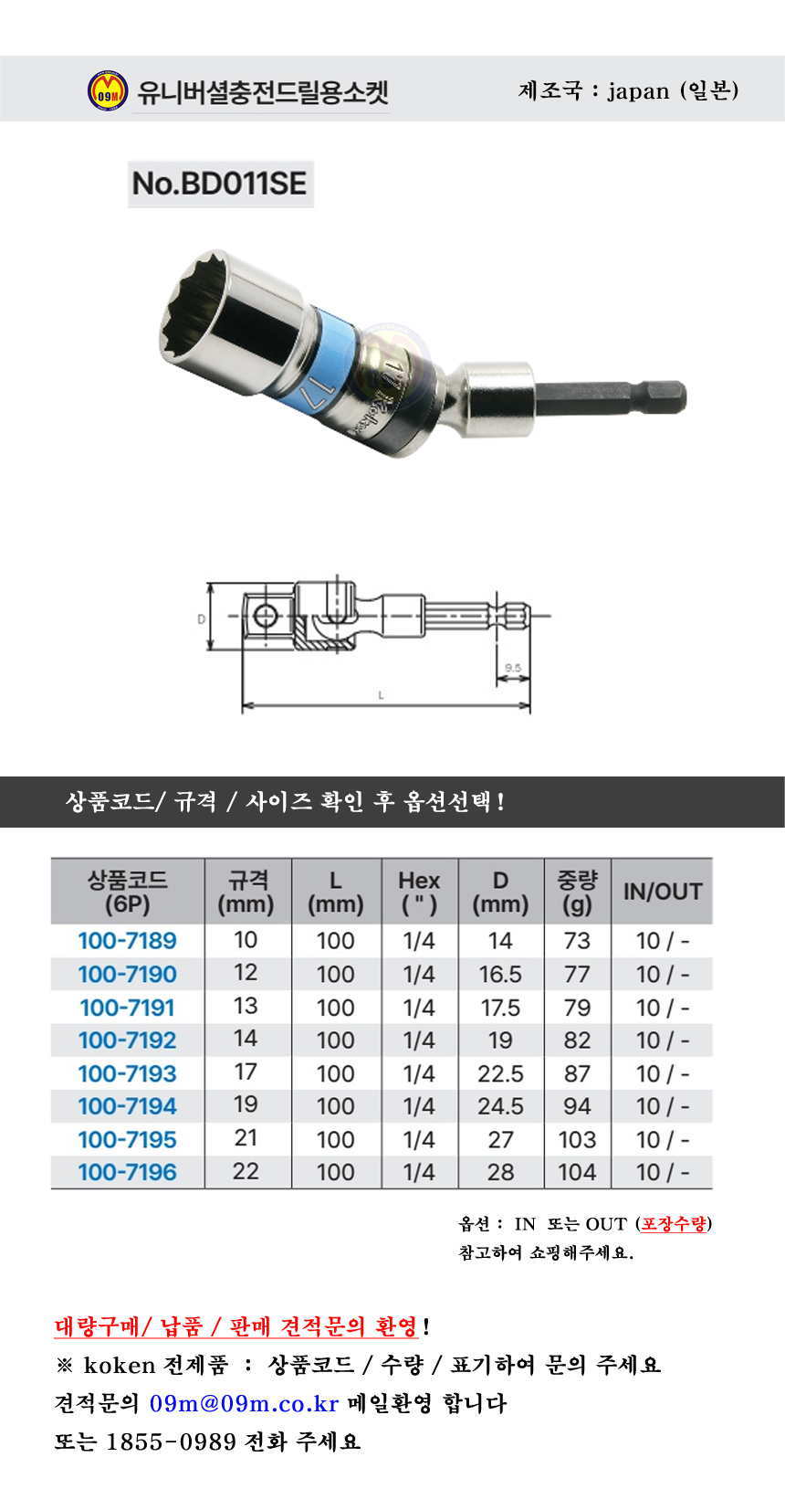 코켄 유니버셜 충전드릴용롱소켓 BD011SE 12p (10mm 22mm) 6P/12P KOKEN, 육각비트소켓,100-7189
