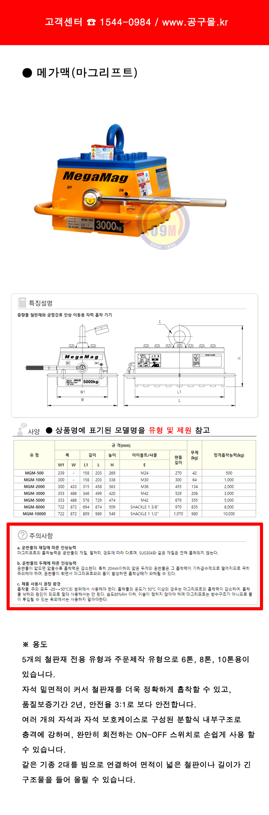 개성 메가맥(마그리프트) 635Kg, MGM-8000 8000kg(평판용), 공구몰, 2610-1156