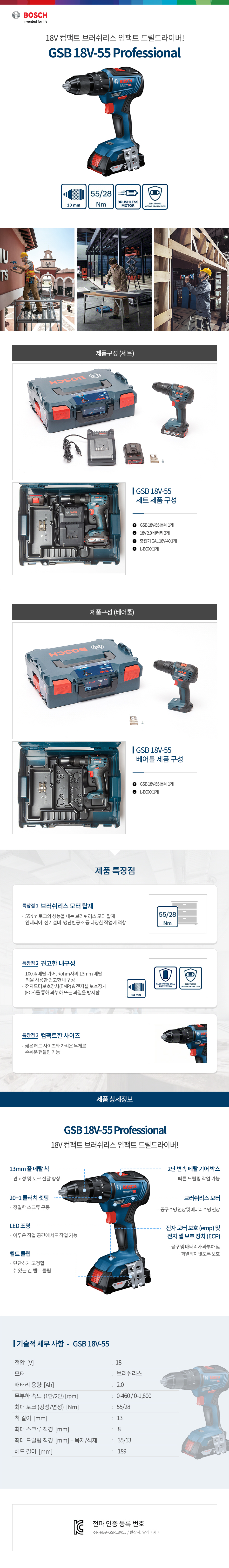보쉬 충전해머드릴 GSB18V-55 (18V/2Ah) BL 해머드릴, 진동드릴, 드릴드라이버, 공구몰,06019H53B2