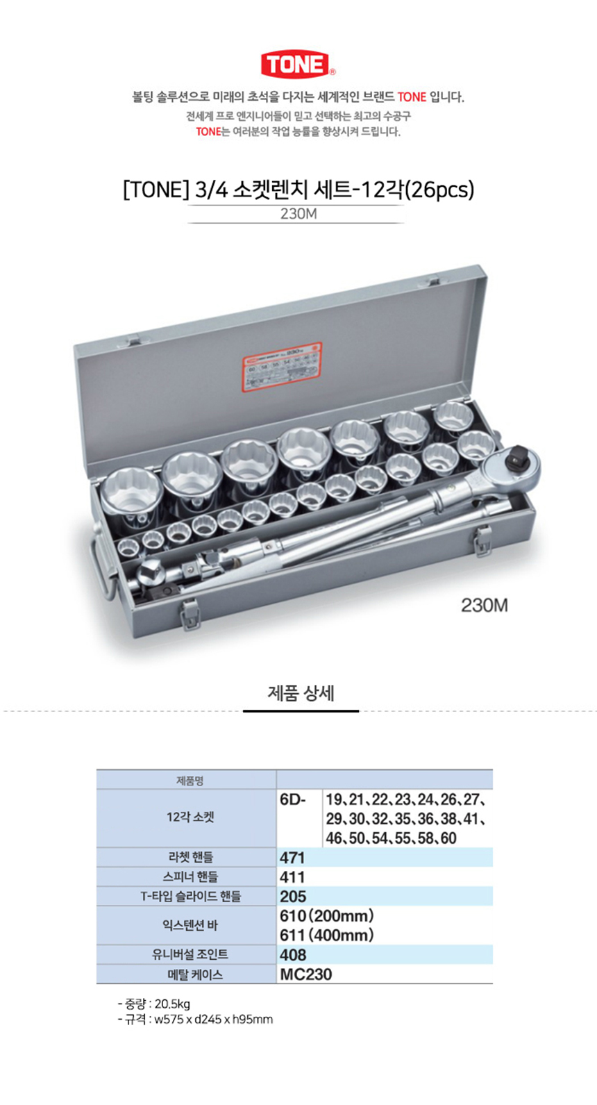 품절,TONE 소켓세트 3/4세트 230M(26PCS)MM-6각 토네, 복스세트, 작업공구