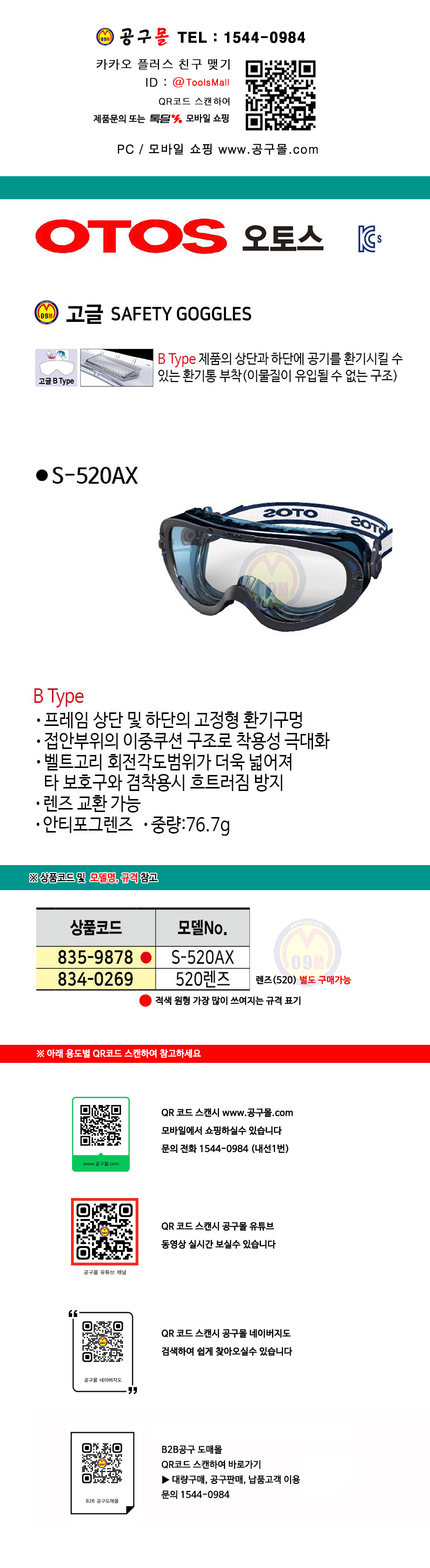 오토스 고글 보안경 S-520AX OTOS, 고글안경, 835-9878
