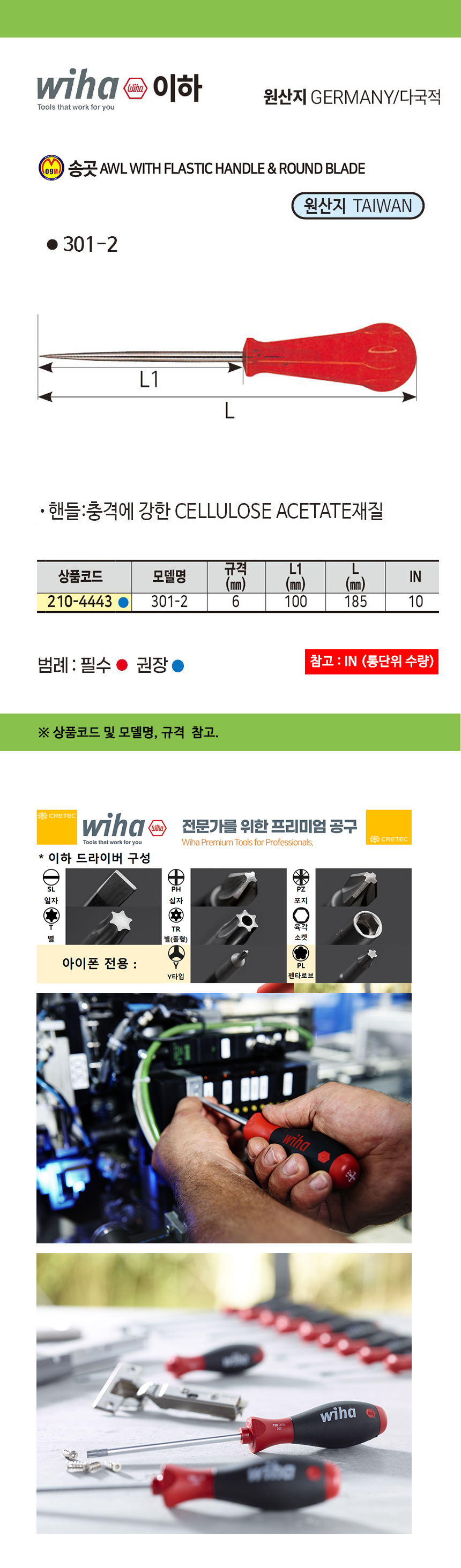 이하 송곳(원형) 301-2 (전장185mm) (6x100) wiha 드라이버 공구몰 210-4443
