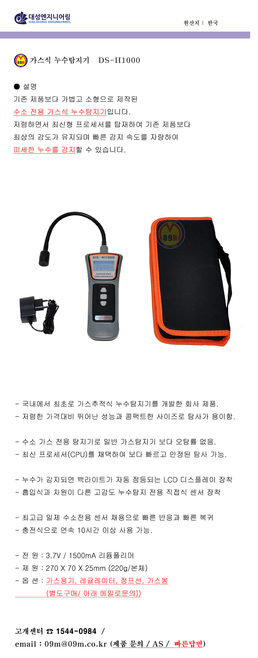 대성 가스식 누수탐지기 DS-H1000 (부속/가스통 별매) 대성엔지니어링 미세한 누수를 빠르게 탐사