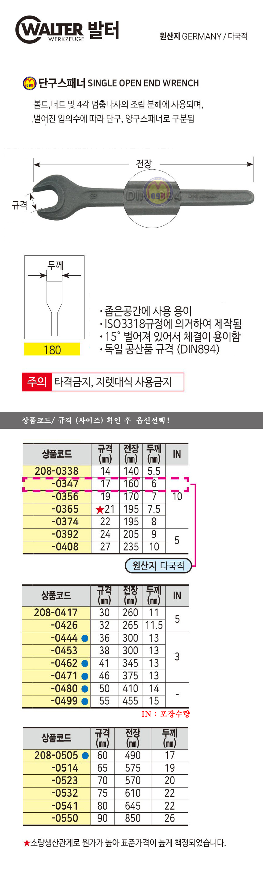 발터 단구스패너 90mm WALTER, 스페너, 공구몰 208-0550