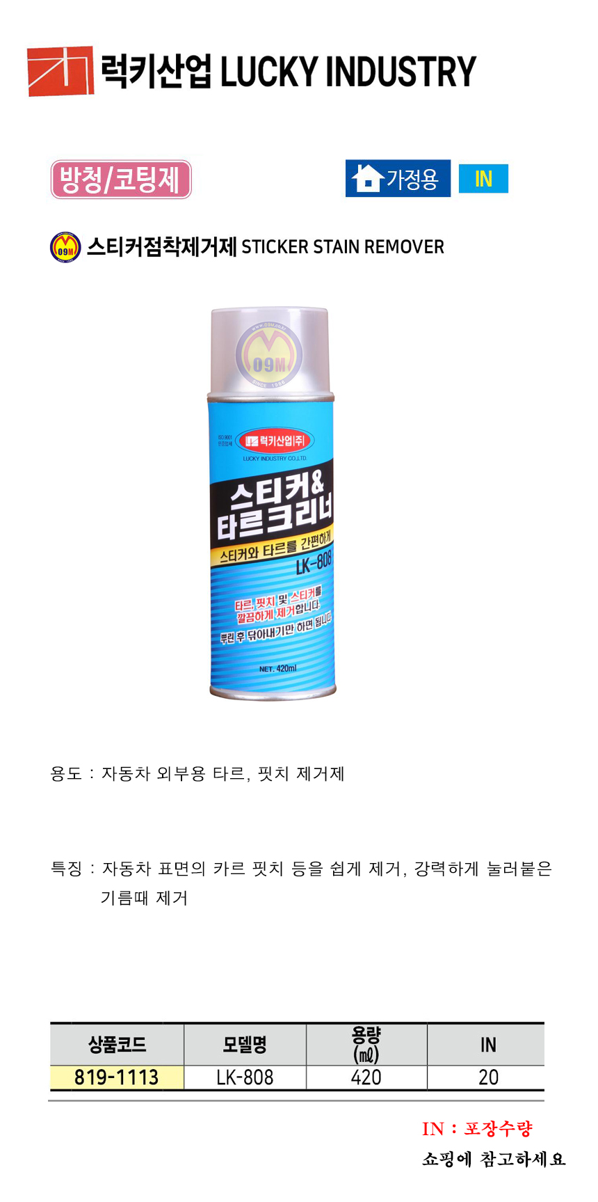 럭키산업 스티커 점착 제거제 LK-808 420ml 스티커&타르크리너 819-1113