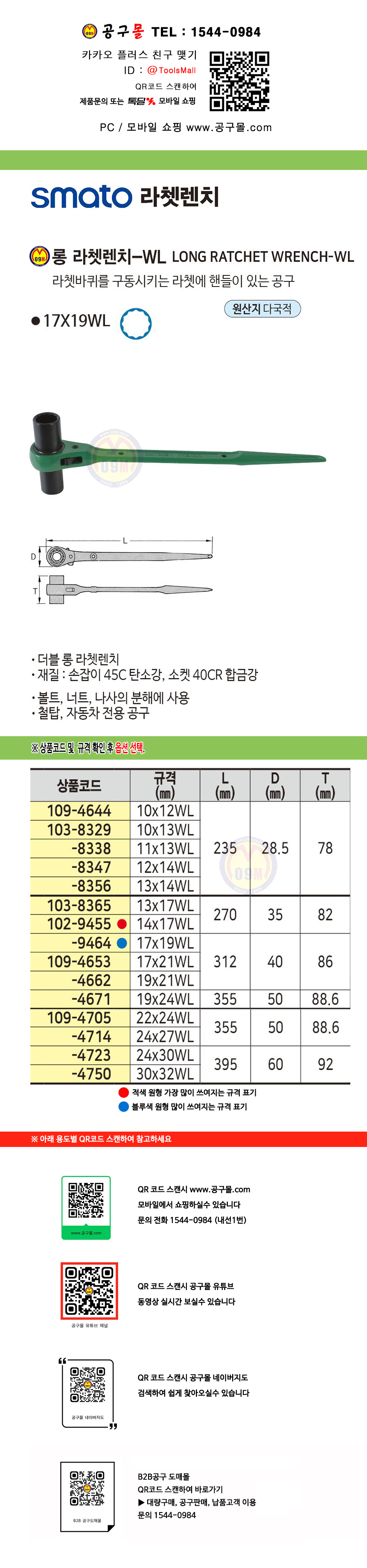 스마토 라쳇렌치(롱-WL) 10mmx12WL/ 19mmx21WL SMATO,라쳇트렌치,109-4644