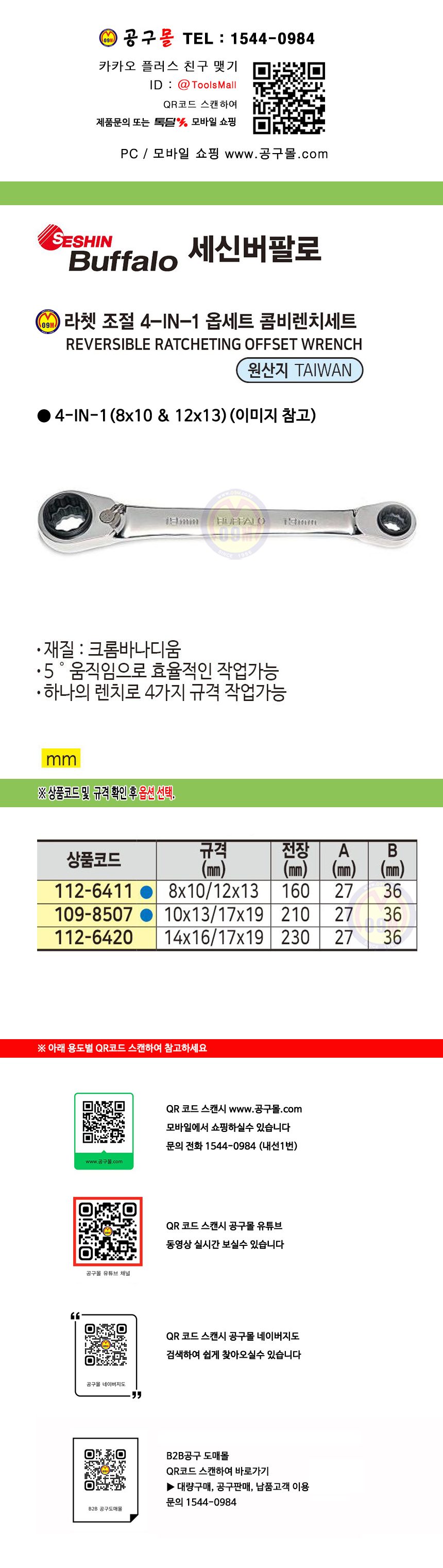 세신 라쳇옵세트렌치-조절4-IN-1 SESHIN Buffalo,버팔로, 링라쳇스패너,112-6411