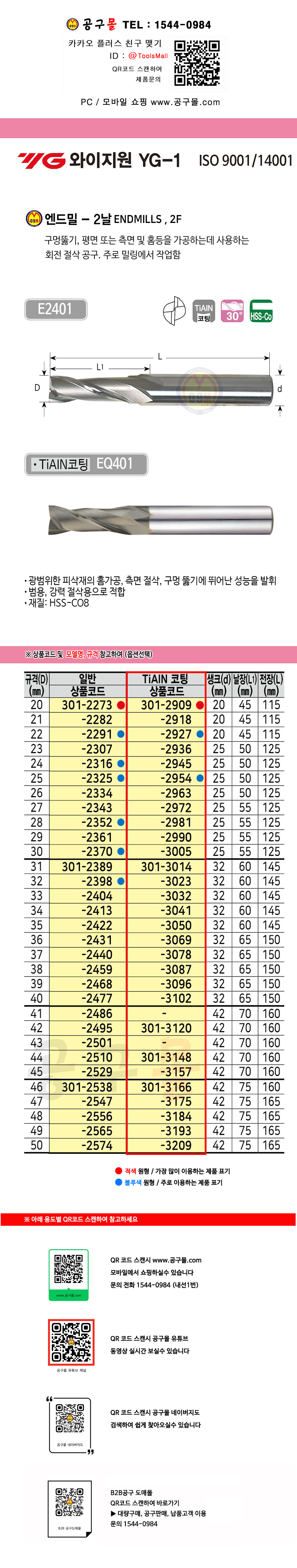 와이지원 하이스엔드밀(코팅,2F-EQ401) 23mm - 30mm YG1, 코팅엔드밀, 절삭공구 301-2936