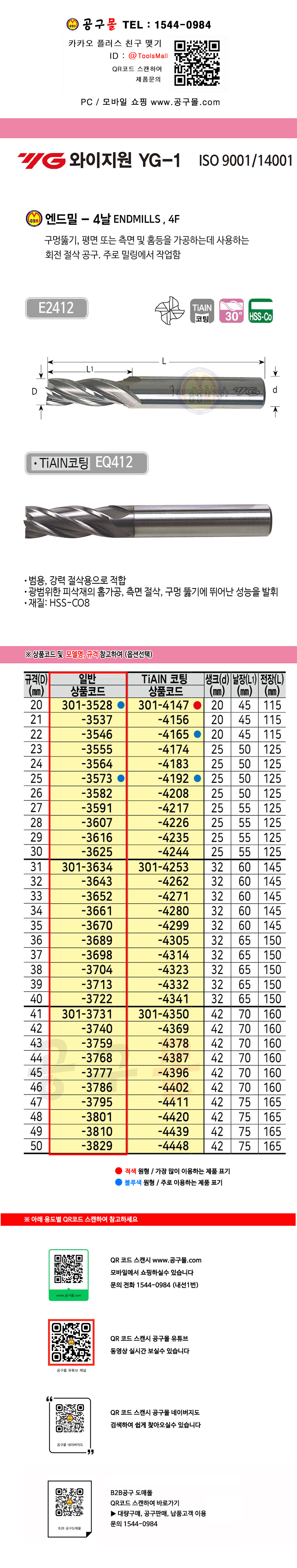 와이지원 하이스엔드밀(코팅,4F-EQ412) 45mm - 50mm YG1, 코팅엔드밀, 절삭공구 301-4396