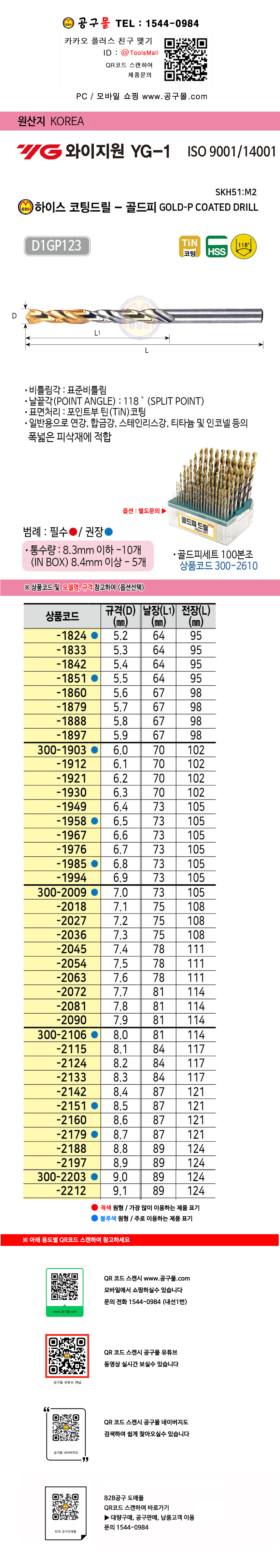 와이지원 하이스코팅드릴 5.2mm - 7.1mm YG1, 스텐드릴, 절삭공구 공구몰 300-1824