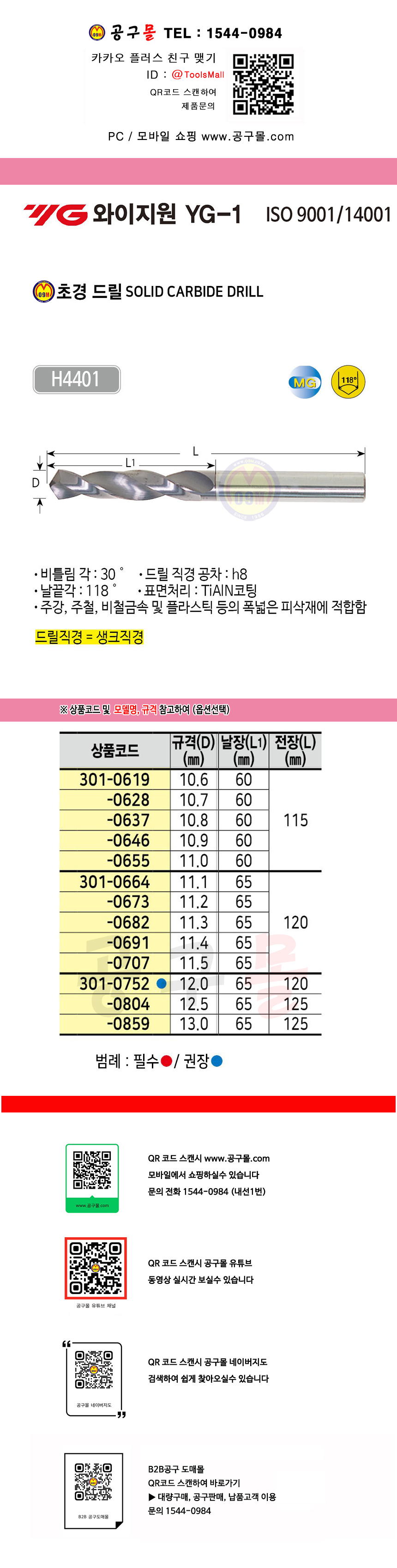 와이지원 초경드릴 10.6mm - 13.0mm YG1, 철길이, 철드릴, 절삭공구 전문점 301-0619