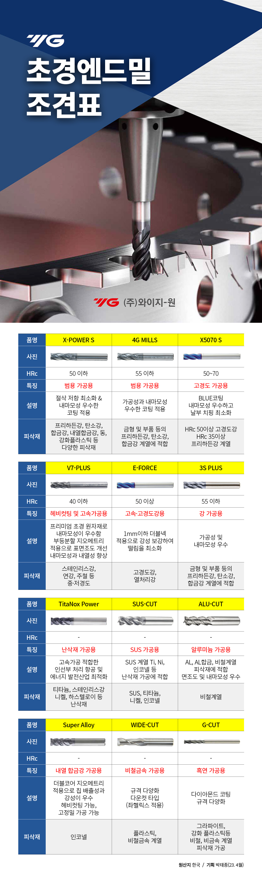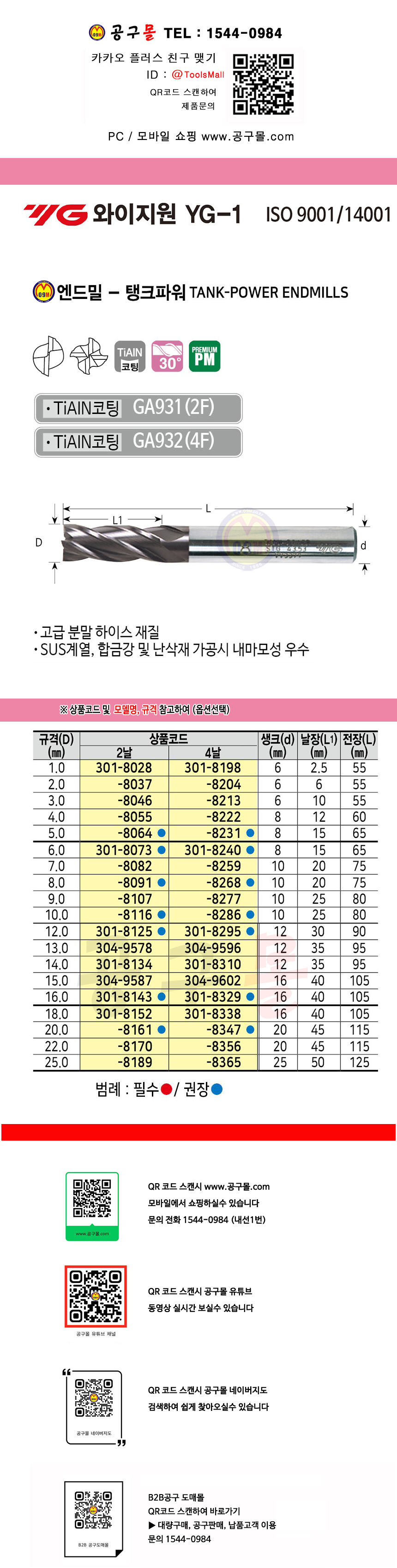 와이지원 하이스엔드밀(2F, 4F) 1mm - 12mm YG1, 탱크파워, 절삭공구 전문점 301-8028/301-8198