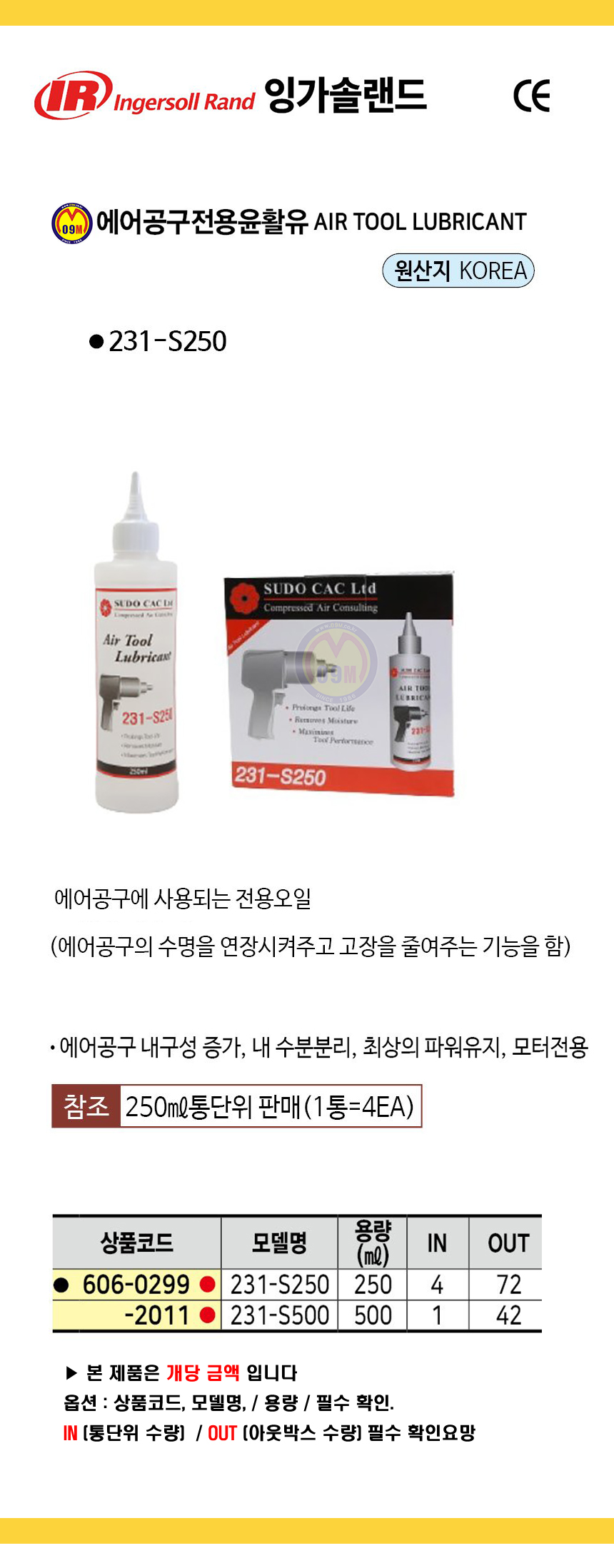 잉가솔랜드 에어공구 전용윤활유 231-S250, 231-S500, INGERSOLL RAND 공구몰 추천 C606-0299