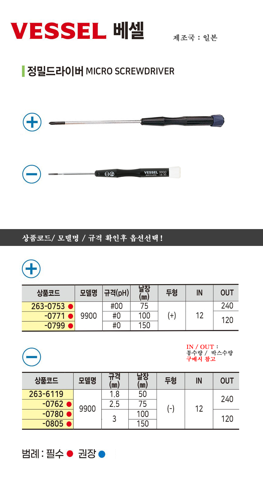 베셀 정밀드라이버 9900 십자2.5x75mm/ 일자3x150mm ) VESSEL