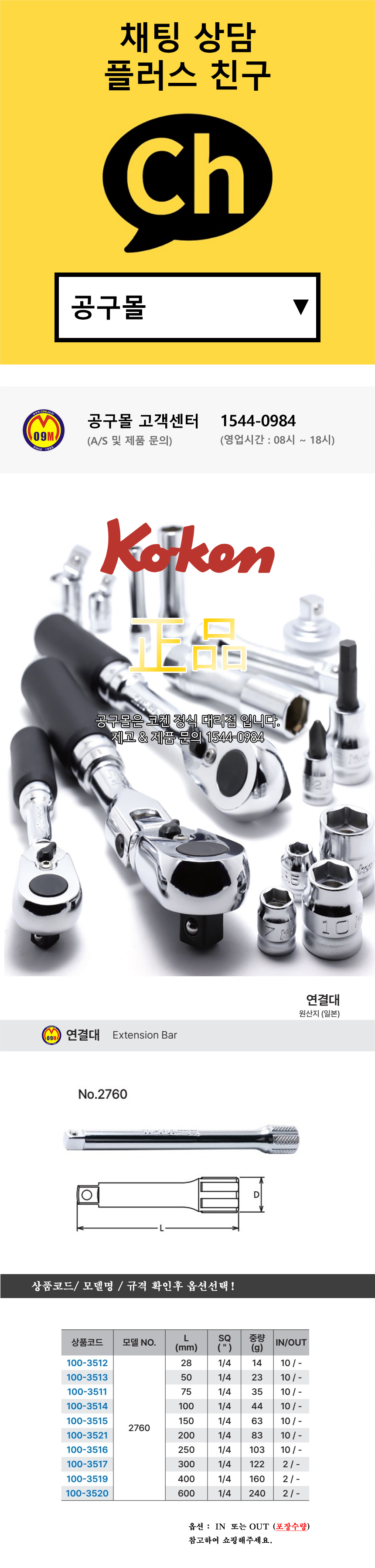 코켄 연결대(2760) 1/4x300mm-600mm KOKEN Extension Bar 공구몰 100-3519