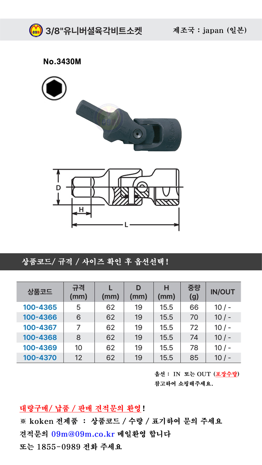 코켄 유니버셜육각비트소켓 3430M 3/8x(5mm 12mm) KOKEN, 육각헤드복스,100-4365