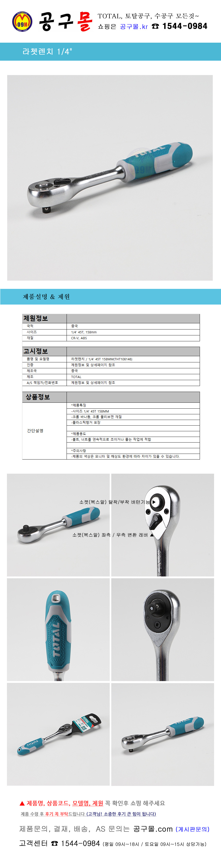 라쳇렌치 1/4-45T-158mm (THT106146) TOTAL,공구세트, 복스세트, 공구몰, 62675