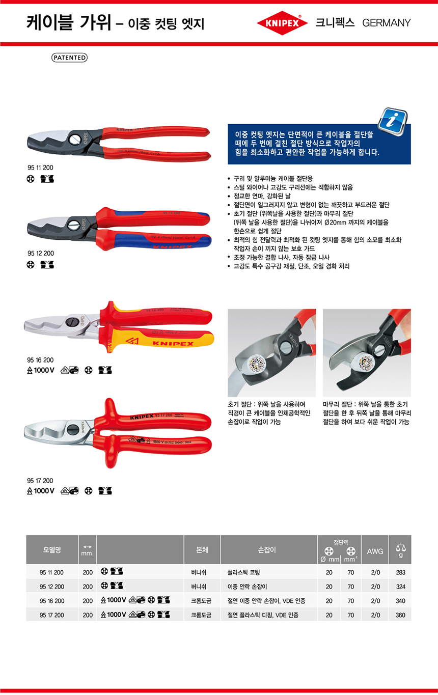 크니펙스 케이블컷터(단면,절연) 95-17-200 1000v 전선커터 KNIPEX 독일공구, 수공구, 공구몰추천 101011510020