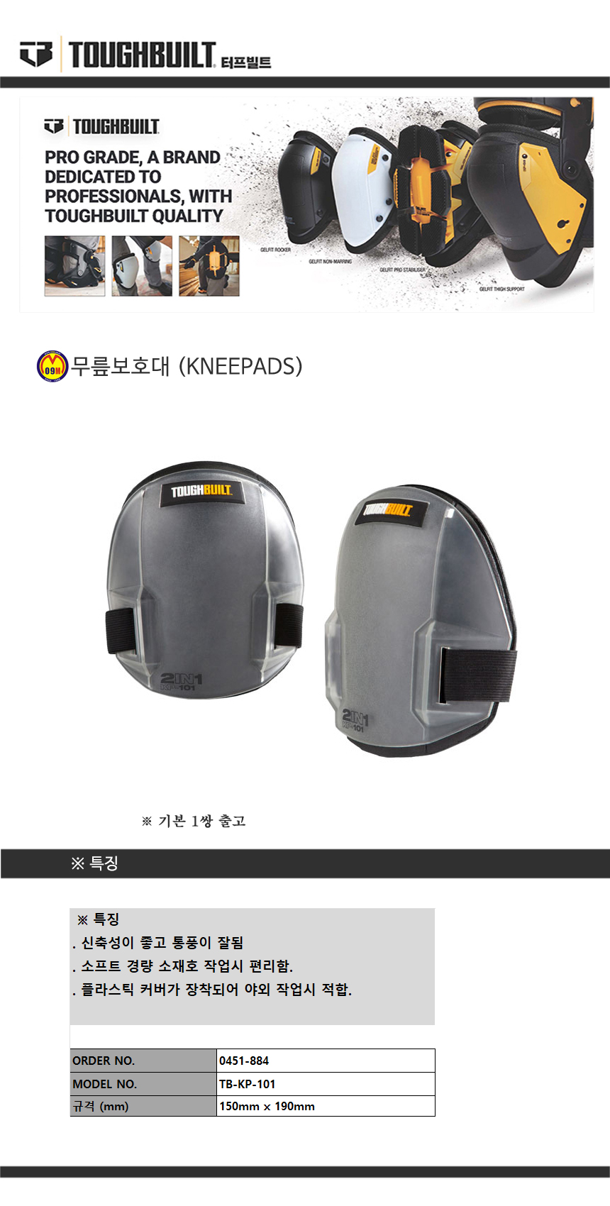터프빌트 무릎보호대(단품) TB-KP-2B (1쌍) 기본 / 탈부착불가 (TOUGH BUILT)0477404