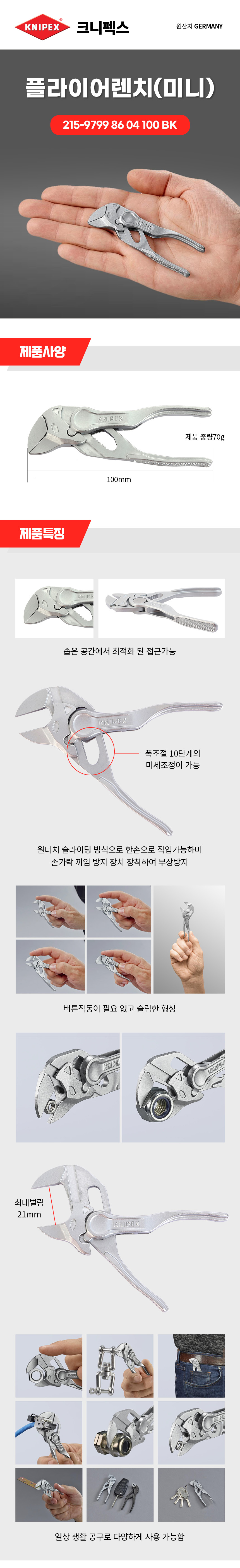 크니펙스 플라이어렌치 86-04-100/ 100BK (0-21mm) Knipex 첼라, 워터펌프플라이어 공구몰 C217-4406