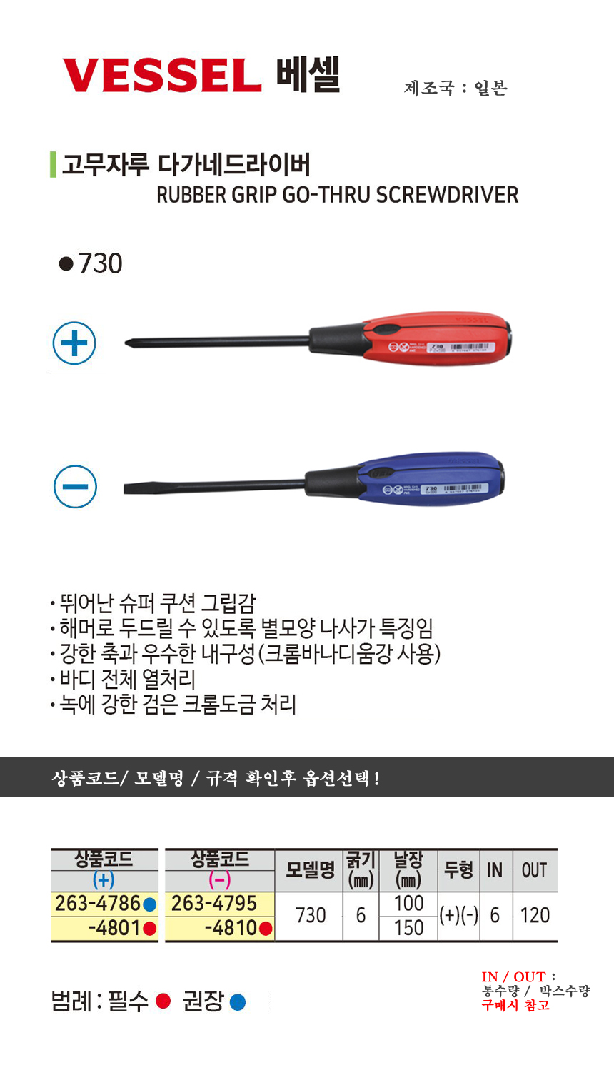 베셀 다가네드라이버(고무자루) 730 십자100mm/ 일자150mm VESSEL