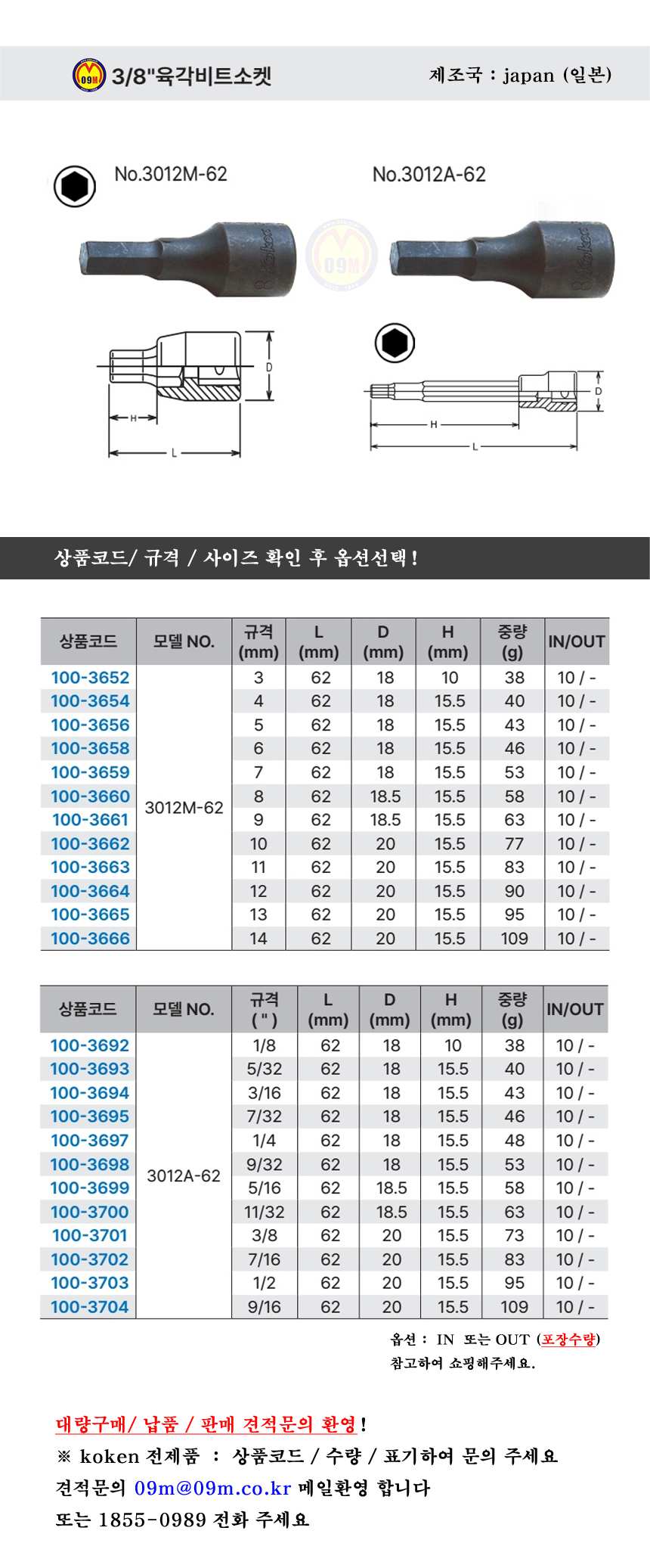 코켄 육각비트소켓 3012M/ 3012A-62 3/8x(3mm, 9/16inch) KOKEN, 육각헤드복스,100-3652